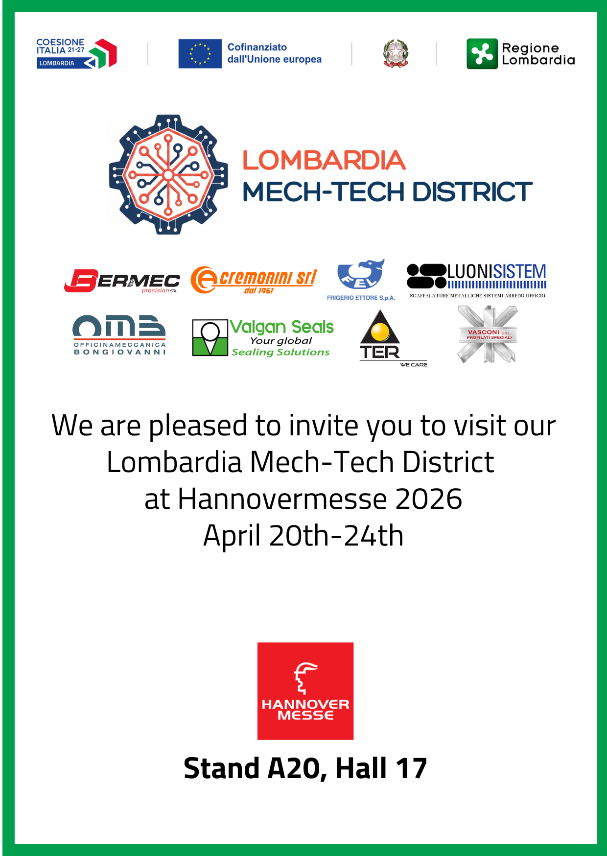 From 20th to 24th April 2026, our company will take part in Hannover Messe 2026 (Hall 17 – Stand A20) as a partner in the project «Lombardia Mech-tech District@Hannovermesse2026».